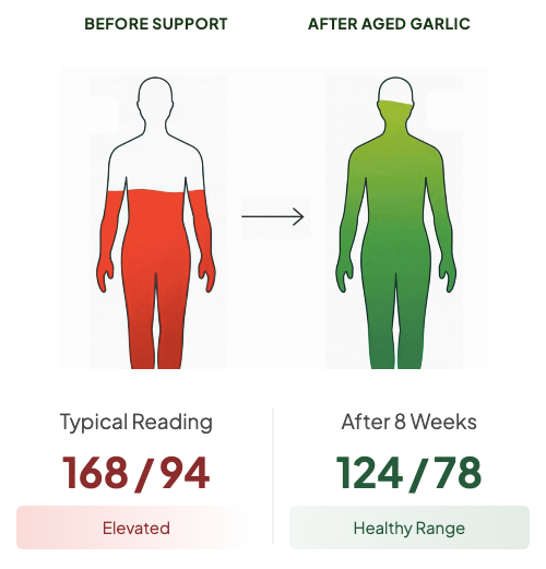 James T. May 2026Verified BuyerFrom 168/94 to 124/78 in 8 Weeks - Numbers Don't LieI'm an engineer, so I track everything. My blood pressure had been climbing for two years despite cutting salt, exercising more, losing 20 pounds. Nothing worked. Tried regular garlic pills first - terrible burping and stomach upset. Then found garlic extract aged garlic. Took morning and evening readings daily. Week 1: slight improvement. Week 4: noticeable drop. Week 8: 124/78 consistently. My wife says I seem less stressed too. The aging process really does make a difference.
